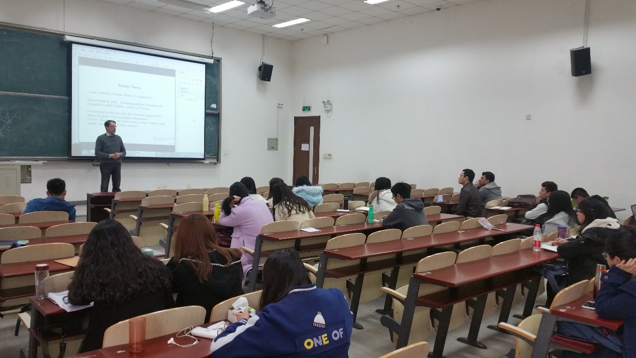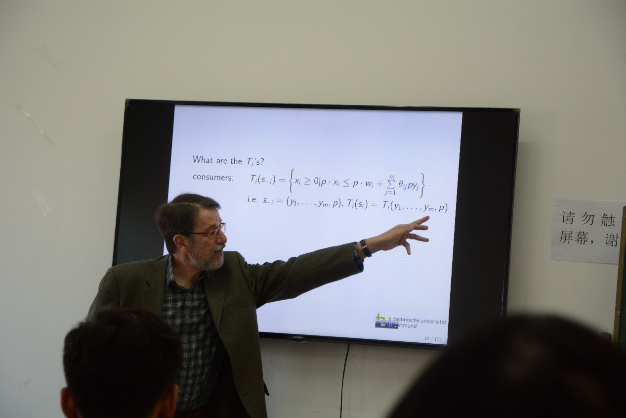 在第一次课程中,教授对经济学的方法论进行了高屋建瓴的阐述,不仅从经济学历史角度讲解了经济发展过程中一般均衡理论的发展脉络,梳理了历次诺贝尔获奖的经济学家,而且从博弈论以及拍卖理论角度阐述了获得诺贝尔奖的经济学家的主要贡献。并对二者进行了对比。从经济学学角度的介绍,给听众带来了非常宏观的经济学研究视角,对百年来经济学发展的深入理解和独特眼光,令人深为敬佩。Leininger教授是德国鲁尔乐天使体育官网的主要负责人,经常在主要的学术会议上进行精彩评论。Leininger教授的此次精彩演讲向我们展现了德国教授深刻的理论积淀和广博的学识。