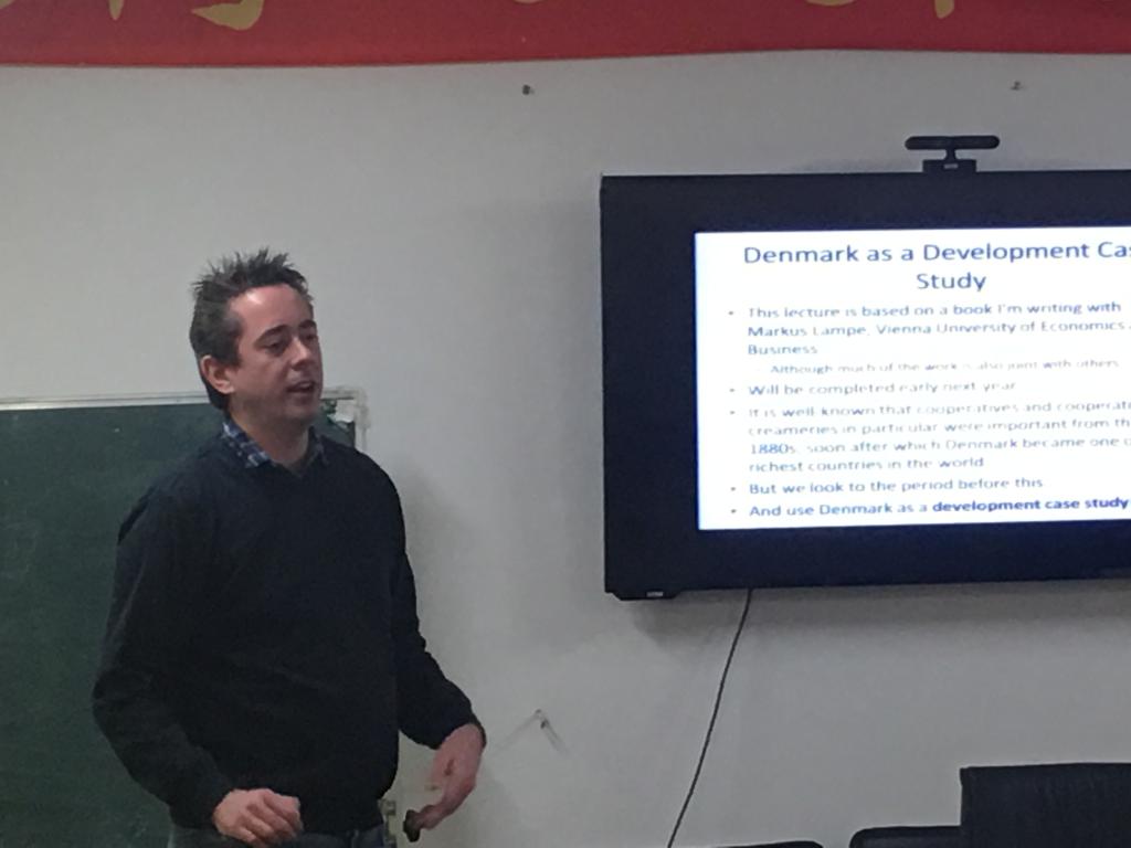 2016年12月7日,南丹麦大学(University of Southern Denmark)经管学院Paul Richard Sharp教授在乐天使体育官网1305会议室为我校师生举办题为“The Danish Development Miracle”的讲座,并就经济学研究问题与与会师生进行研讨。