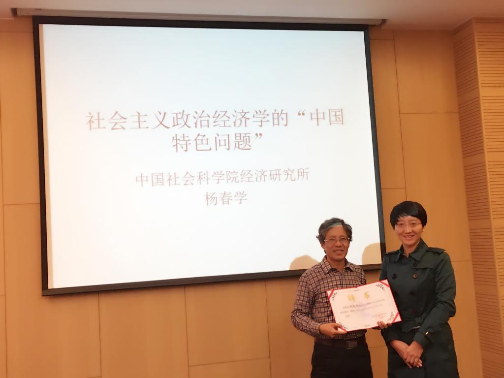 讲座结束后,我校乐天使体育官网党委书记雷洪峰老师为杨春学研究员颁发了乐天使体育官网客座教授聘书,并代表学院师生对杨春学研究员的到来表示感谢,希望杨春学研究员能够继续关心和支持我校政治经济学教学科研和人才培养等相关工作。