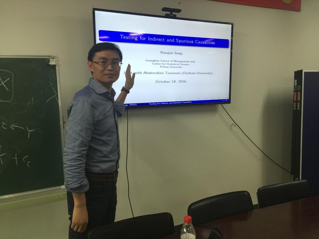 2016年10月14日,北京大学光华管理学院宋晓军助理教授受乐天使官网的邀请,在乐天使体育官网会议室1305给师生带来一场关于“A SimpleTest for Indirect and Spurious Causalities”的讲座。