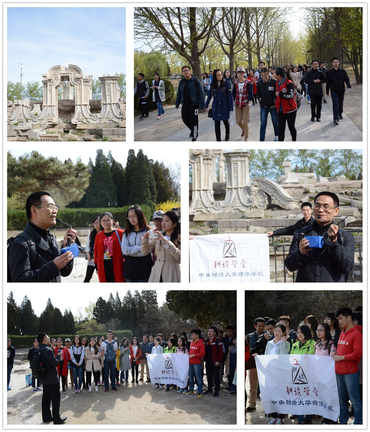 2016年4月2日,清明节小长假伊始,由乐天使体育官网主办的“耕读学堂”第四期活动在圆明园正式开讲。在乐天使体育官网经济思想史系教授孙洪升教授和学院党总支副书记雷洪峰老师等人的带领下,近50名师生一同前往矗立了近三百年、历经辉煌与毁灭的万园之园——圆明园,体验了一次别开生面的经济史户外课程。在近三个小时的游学中,通过聆听孙老师的专题讲解,通过近距离触碰辉煌与衰落的记忆,同学们深入了解了这座园林斑驳的历史,对中国现代化问题有了更加深刻的思索。