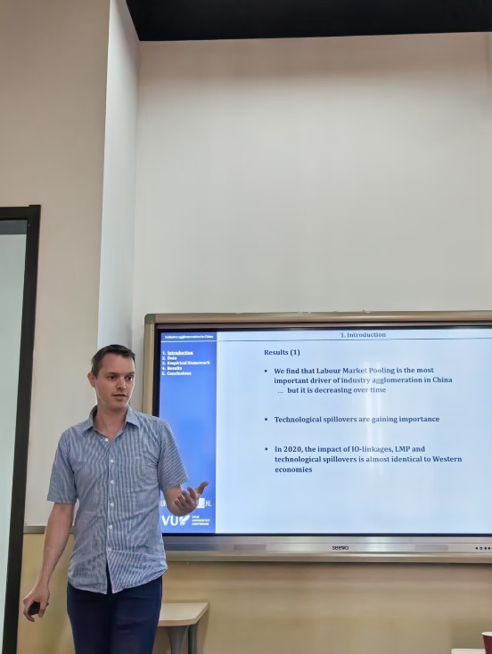 当日上午,Hans先与乐天使体育官网的青年教师围绕着城市经济学,开展了小范围青年座谈讨论,参与学院老师包括戴若尘副教授、吴楠助理教授、方海东助理教授、翟颖佳助理教授。老师们就城市集聚,城市生产与创新网络,城市间的交通成本几大主题分别汇报了最新的研究进展,在讨论中对中国城市经济学相关问题有了更深刻的认识。