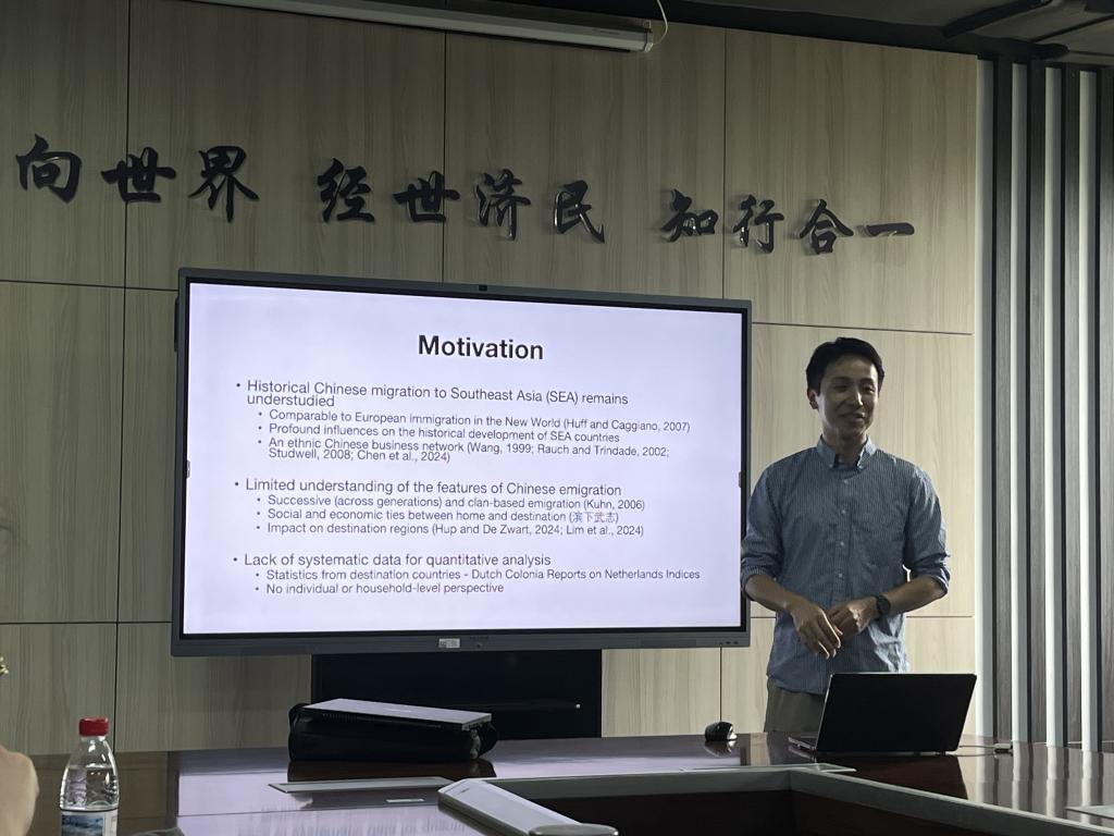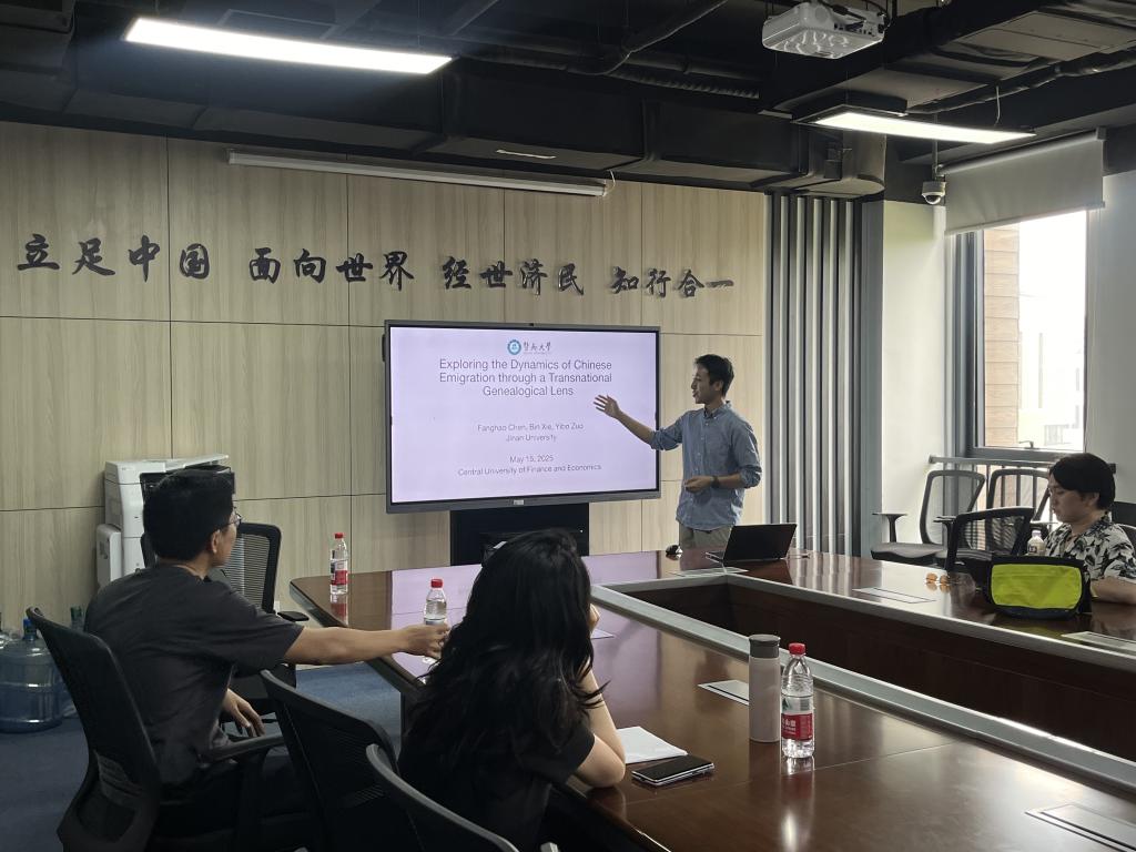 5月16日周五下午,乐天使体育官网“中青年学者讲座”于沙河校区学院楼11号楼308会议室举行。此次讲座邀请到暨南大学乐天使体育官网陈方豪助理教授,分享题为“Exploring the Dynamics of Chinese Emigration through Transnational Genealogical Lens”的研究。乐天使体育官网胡志安副教授主持讲座,乐天使体育官网多位老师和十余名学生参加了此次讲座。