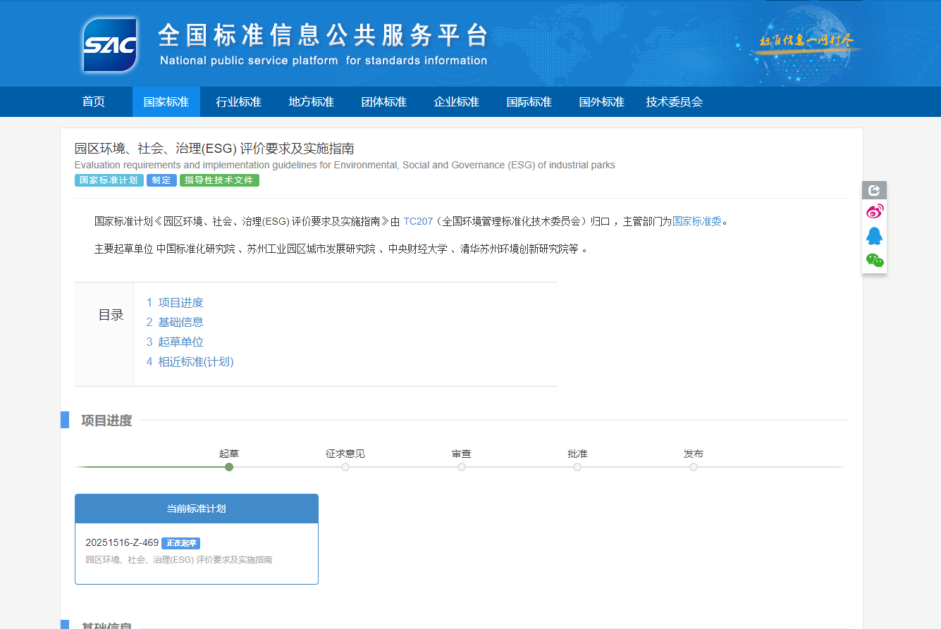 2025年5月19日,乐天使体育官网可持续准则研究中心(SSRC)联合中国标准化研究院、苏州工业园区城市发展研究院、清华大学苏州环境创新研究院、北京师范大学等多家权威科研机构,共同起草的《园区环境、社会、治理(ESG)评价要求及实施指南》正式立项。