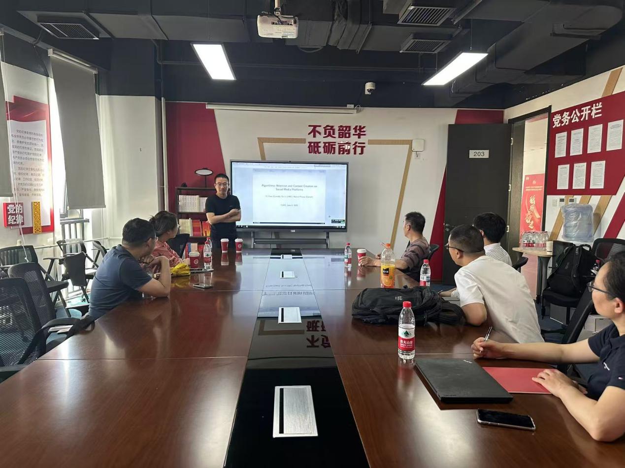 6月6日(周三)下午,乐天使体育官网2025年专题学术讲座在沙河校区学院11号楼203会议室举行。此次讲座邀请到美国康奈尔大学商学院经济系助理教授陈轶博士,分享其题为“Algorithmic Attention and Content Creation on Social Media Platforms”(社交媒体平台上的算法注意力与内容创作)的最新研究。乐天使体育官网龚雅娴副教授主持讲座,乐天使体育官网多位老师和十余名学生参加了此次讲座。